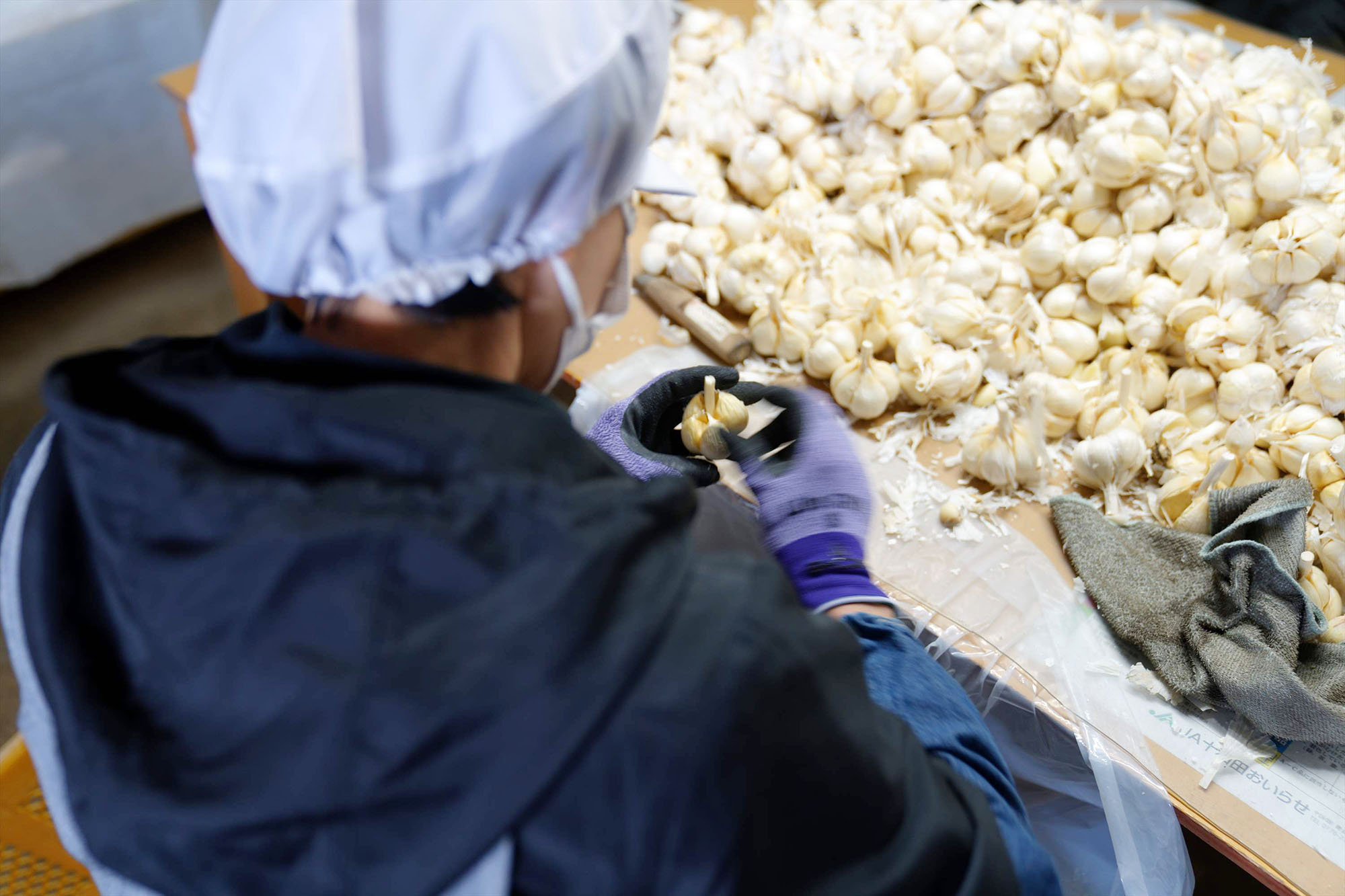エアーでにんにくのほこりや土を取り除いたあと「傷んでいる物や異物などが付着していないか」など、見落としがないように一つ一つ確認をしていきます。